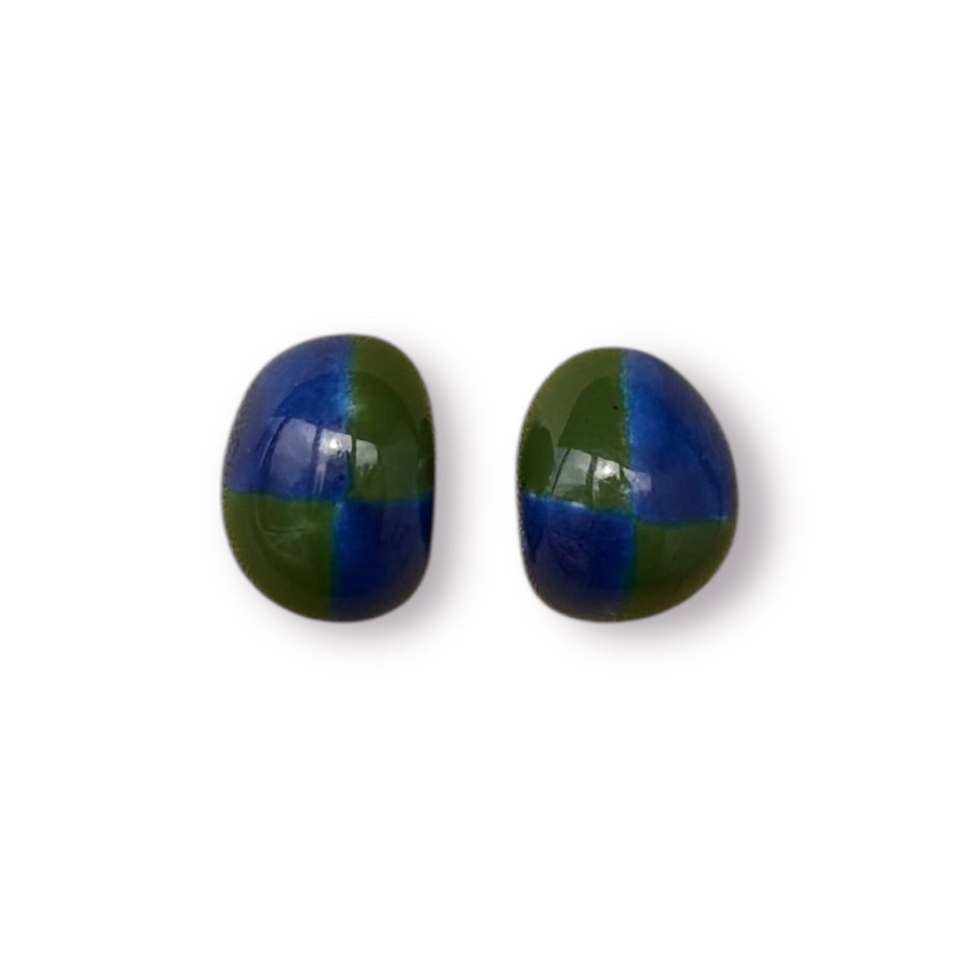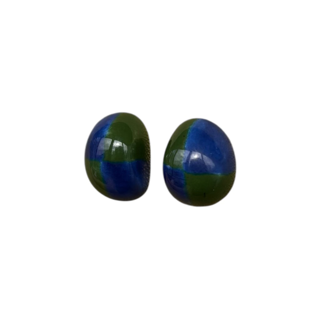 Brinco feito a mão em porcelana com esmalte azul e verde.