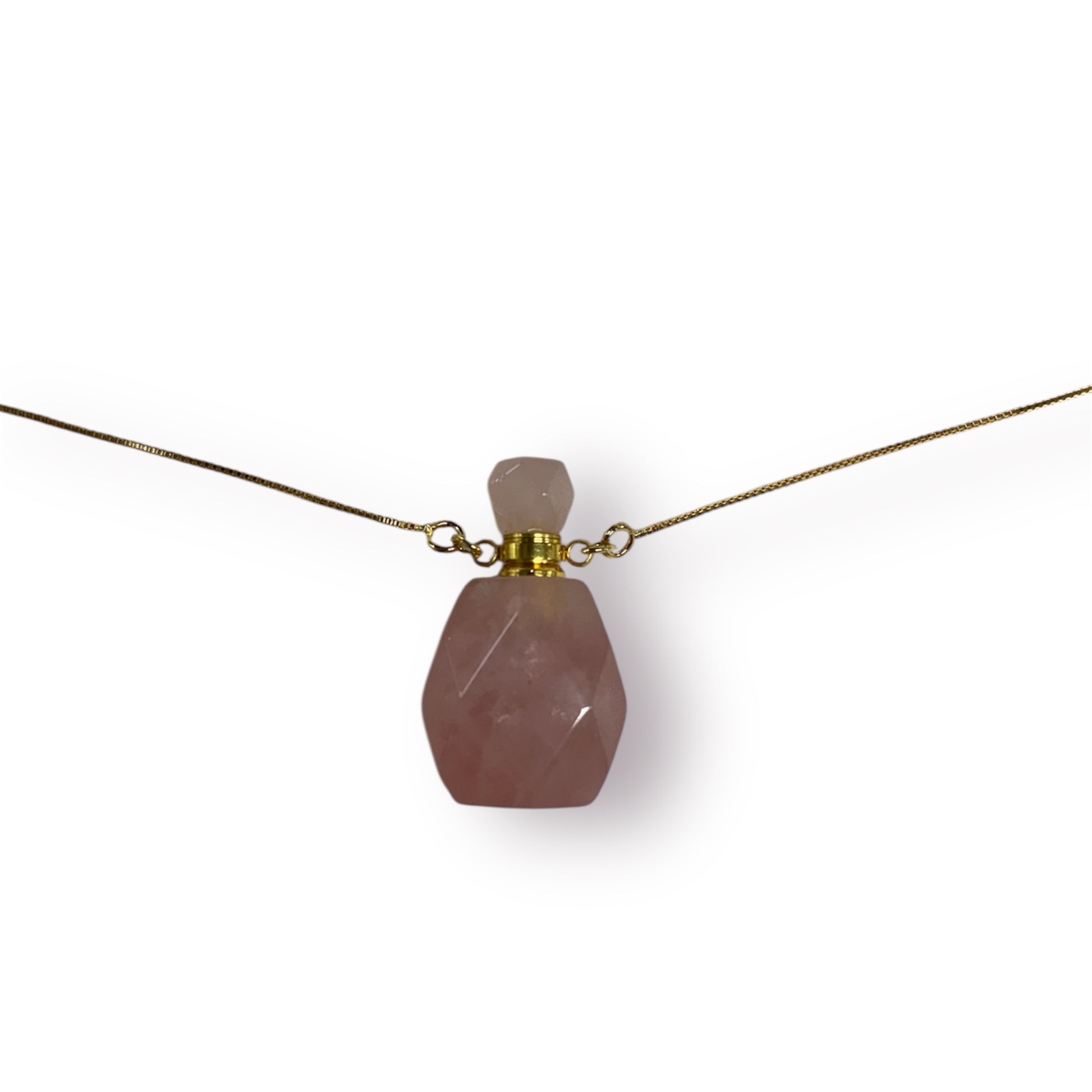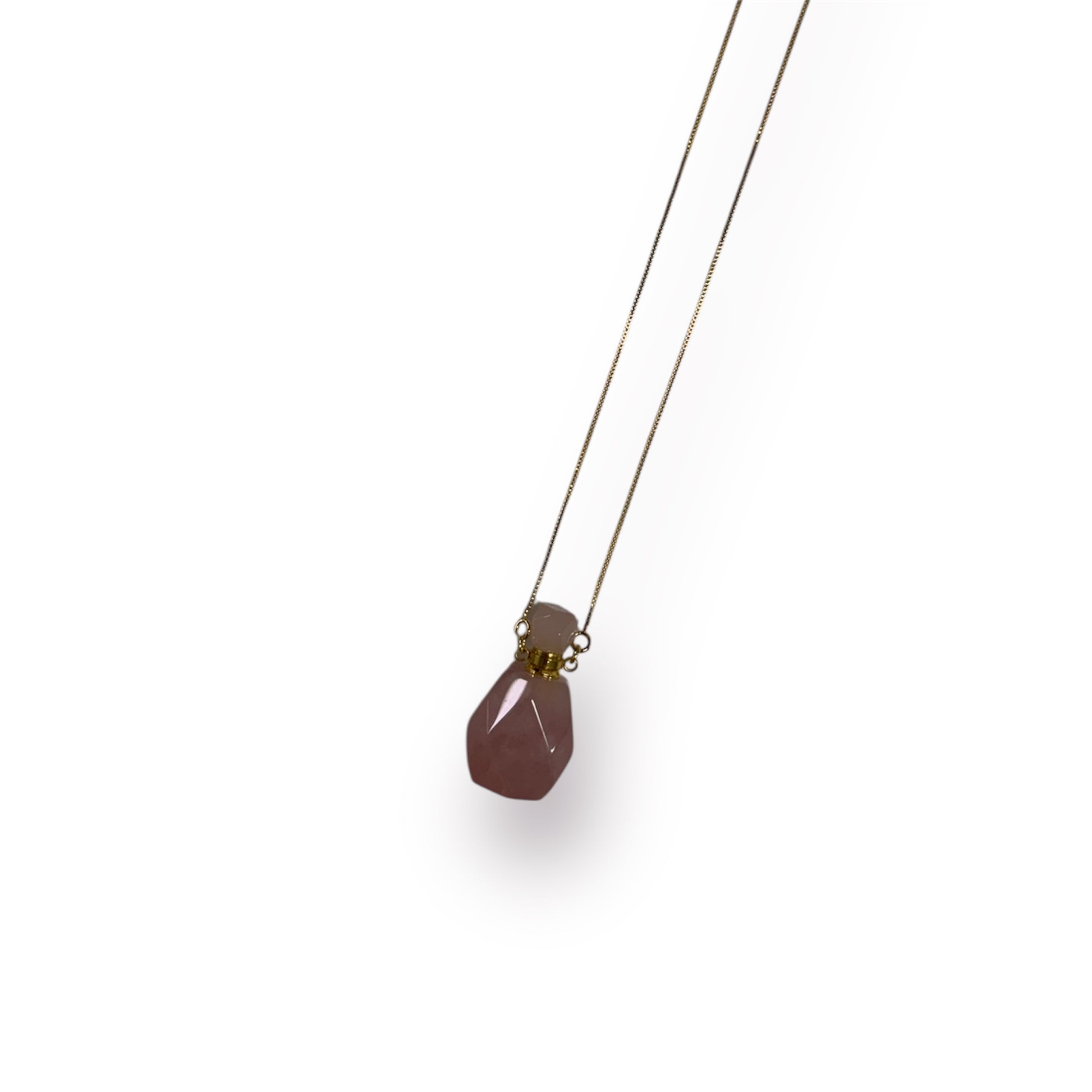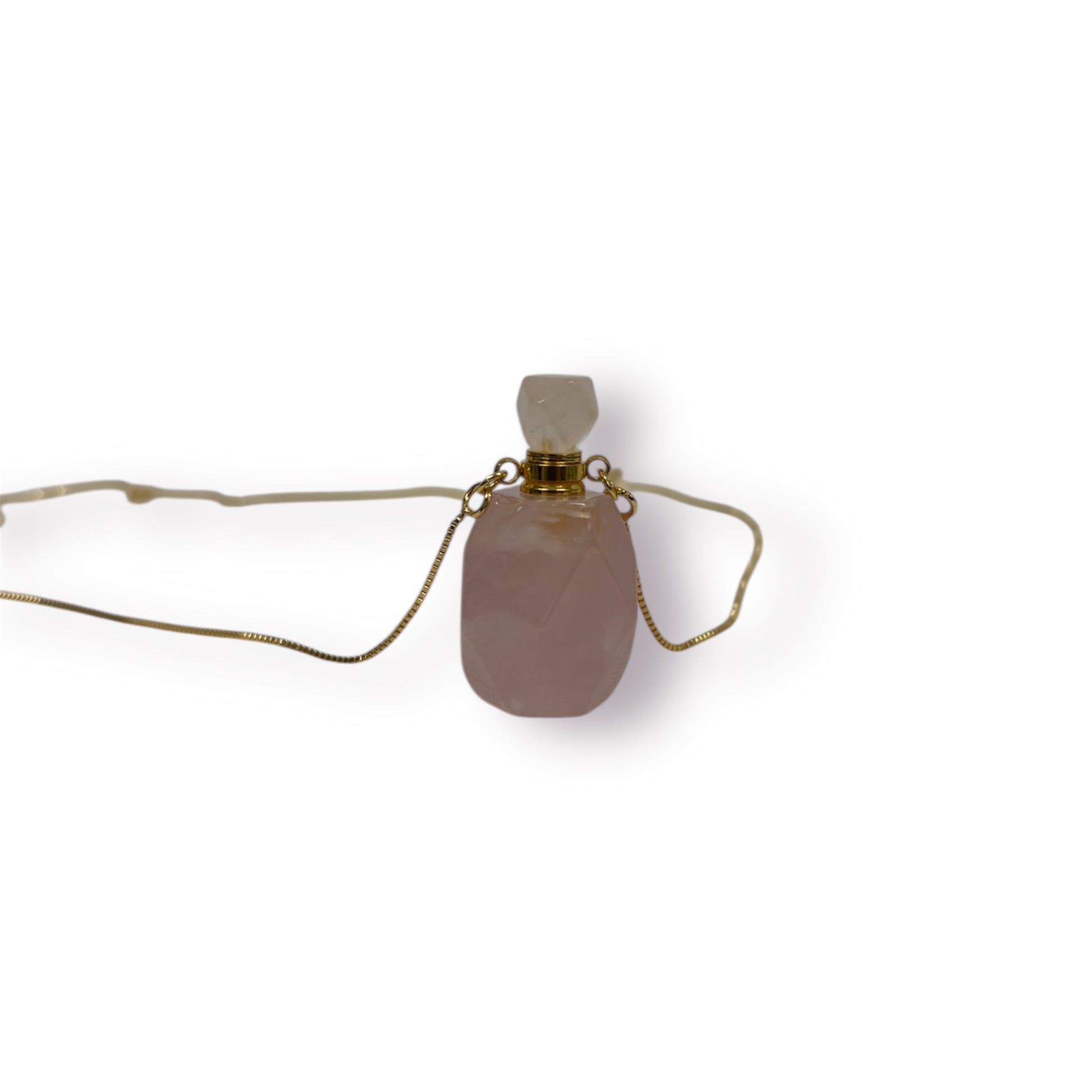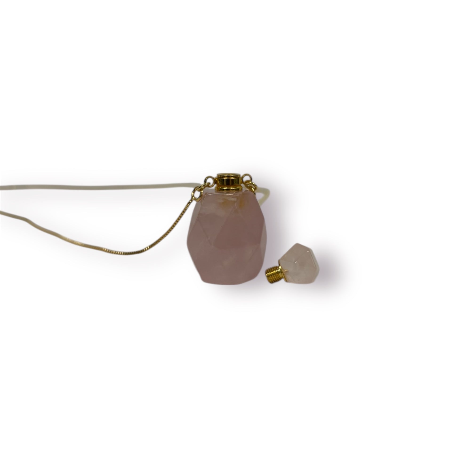 Pingente de Quartzo Rosa em formato de frasco com tampa de rosca. Próprio para colocar óleo essencial ou perfume.