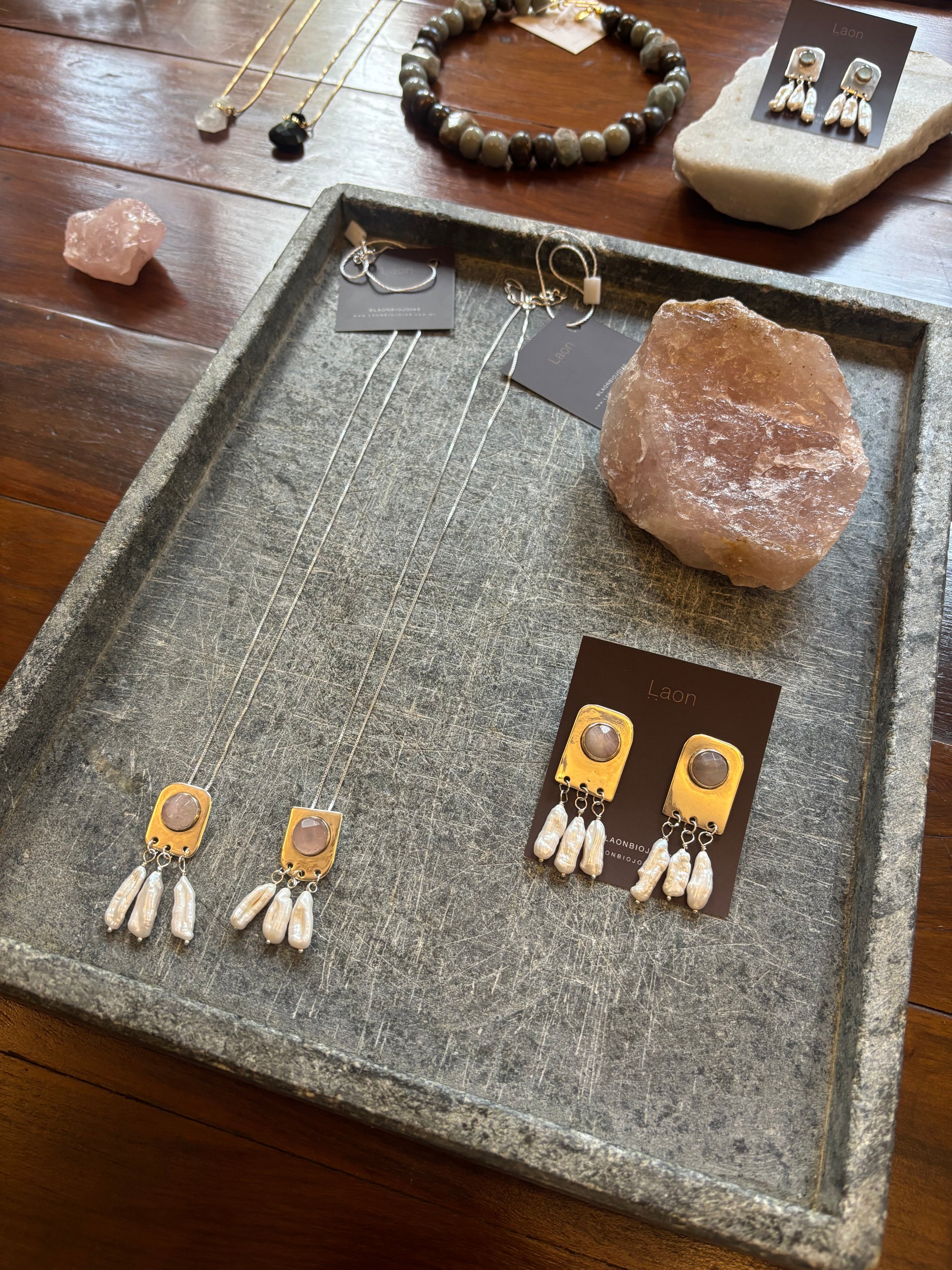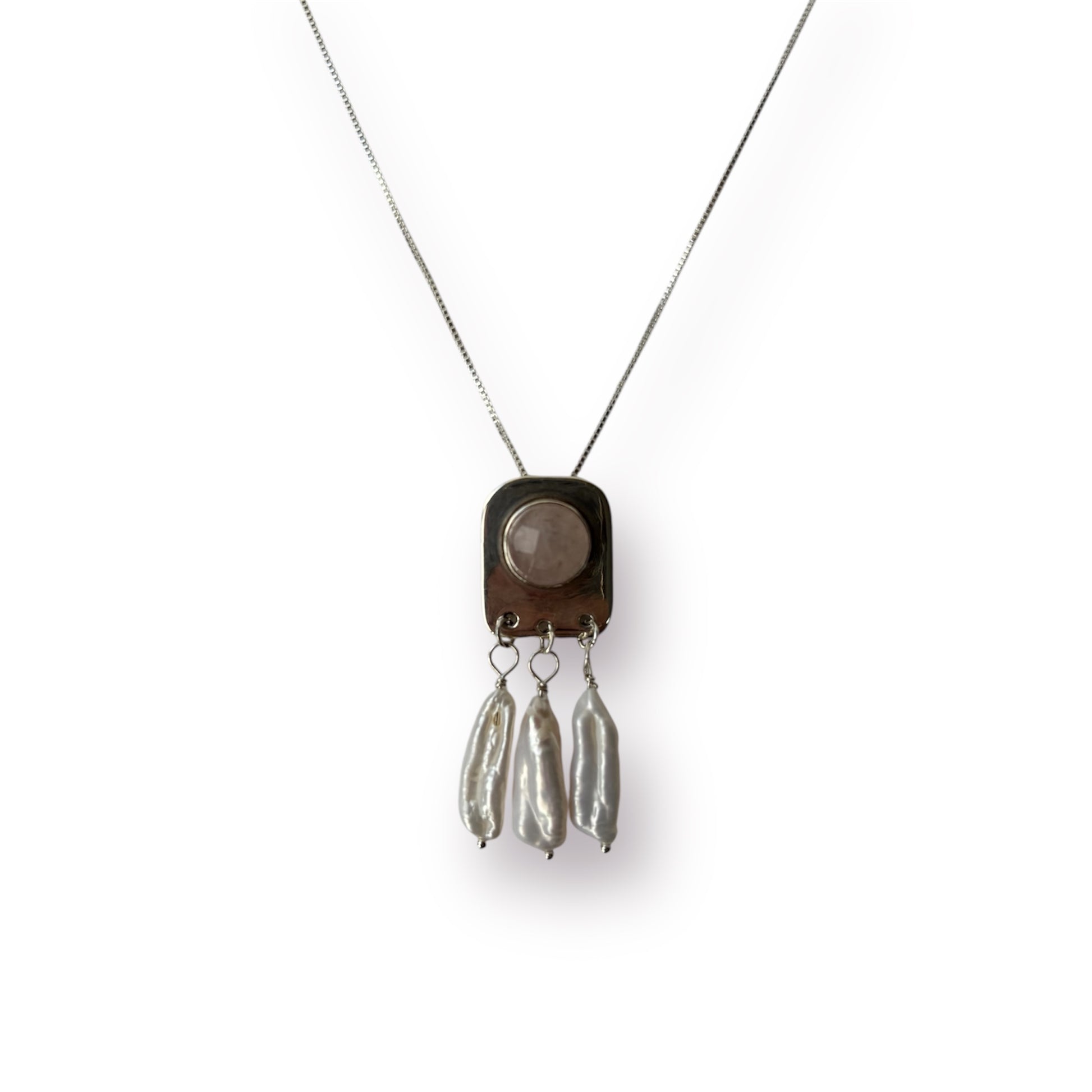 Pingente feito à mão em joalheria de bancada, com quartzo rosa cravado e penduricalhos em pérola de água doce. Acompanha corrente veneziana em prata, de 60 cm, que realça a leveza e o movimento do pingente.